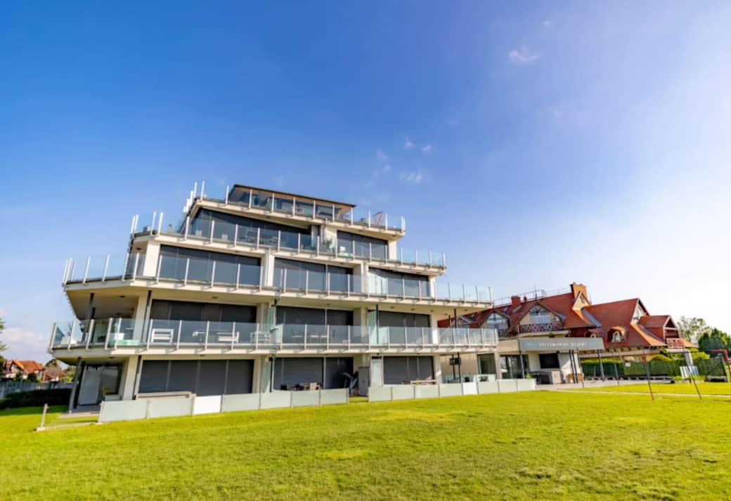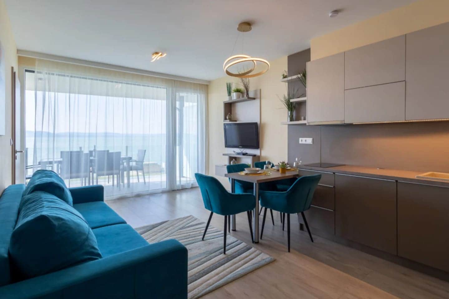 It is ideal for up to 4 guests, featuring two separate bedrooms, each with a double bed. The living room, dining area, and kitchen are in one open space, designed in a modern and well-equipped style. The apartment also has a spacious 18 m² balcony, perfect for relaxing. The building offers shared waterfront access, making it an ideal choice if you want to stay close to Lake Balaton while avoiding the crowds.