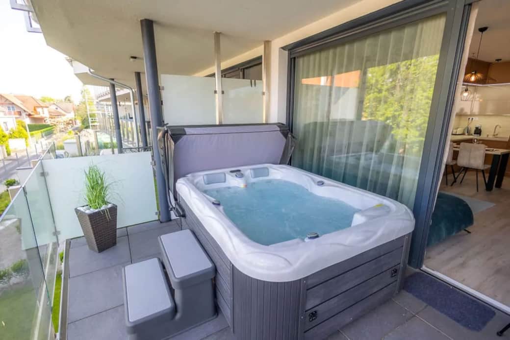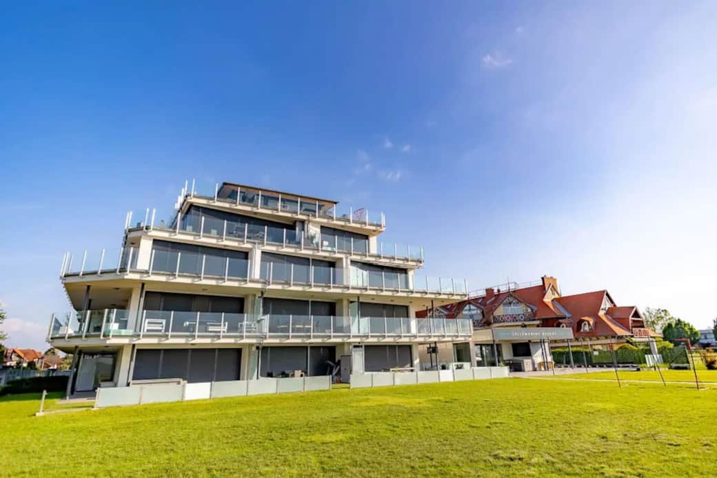 It is ideal for up to 4 guests, featuring two separate bedrooms, each with a double bed. The living room, dining area, and kitchen are in one open space, designed in a modern and well-equipped style. The apartment also has a spacious 17 m² balcony with a hot tub, perfect for relaxing. The building offers shared waterfront access, making it an ideal choice if you want to stay close to Lake Balaton while avoiding the crowds.
