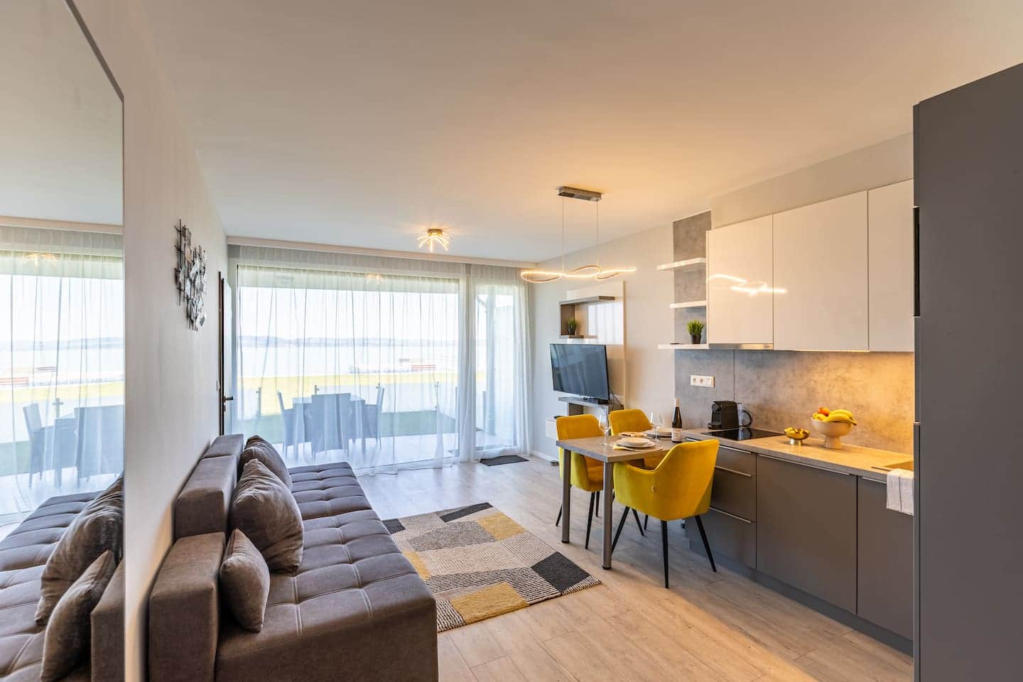 It is ideal for up to 4 guests, featuring two separate bedrooms, each with a double bed. The living room, dining area, and kitchen are in one open space, designed in a modern and well-equipped style. The apartment also has a spacious 18 m² balcony, perfect for relaxing. The building offers shared waterfront access, making it an ideal choice if you want to stay close to Lake Balaton while avoiding the crowds.